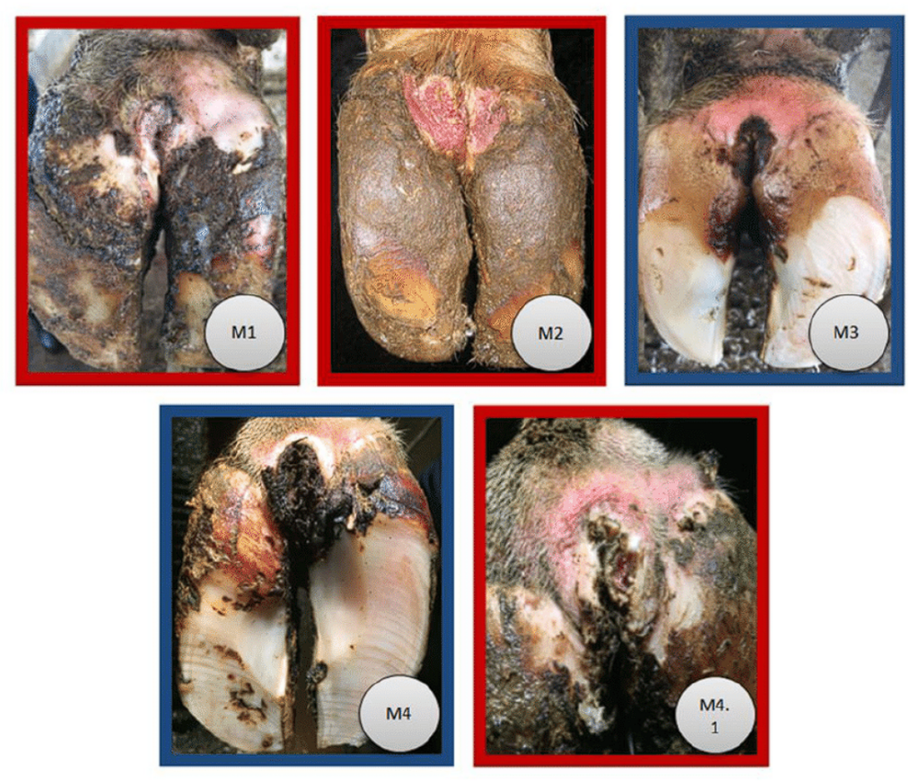 Kolory obramowań widoczne na każdym ze zdjęć dzielą zmiany digital dermatitis na dwa rodzaje: aktywne (czerwona obwódka) oraz nieaktywne (niebieska obwódka).